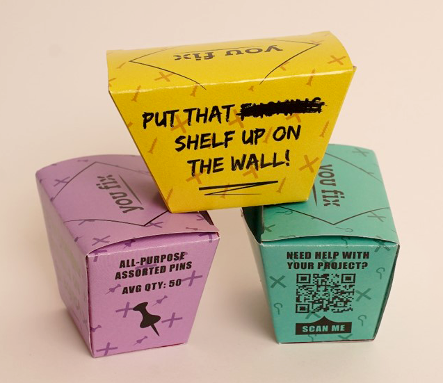 For the ‘Pick, Pack, Sell!’ brief, I designed DIY product packaging for screws, pins, and hooks, targeting students moving into new homes. My goal was to make DIY more accessible and engaging, moving away from the dull, male-oriented aesthetic.